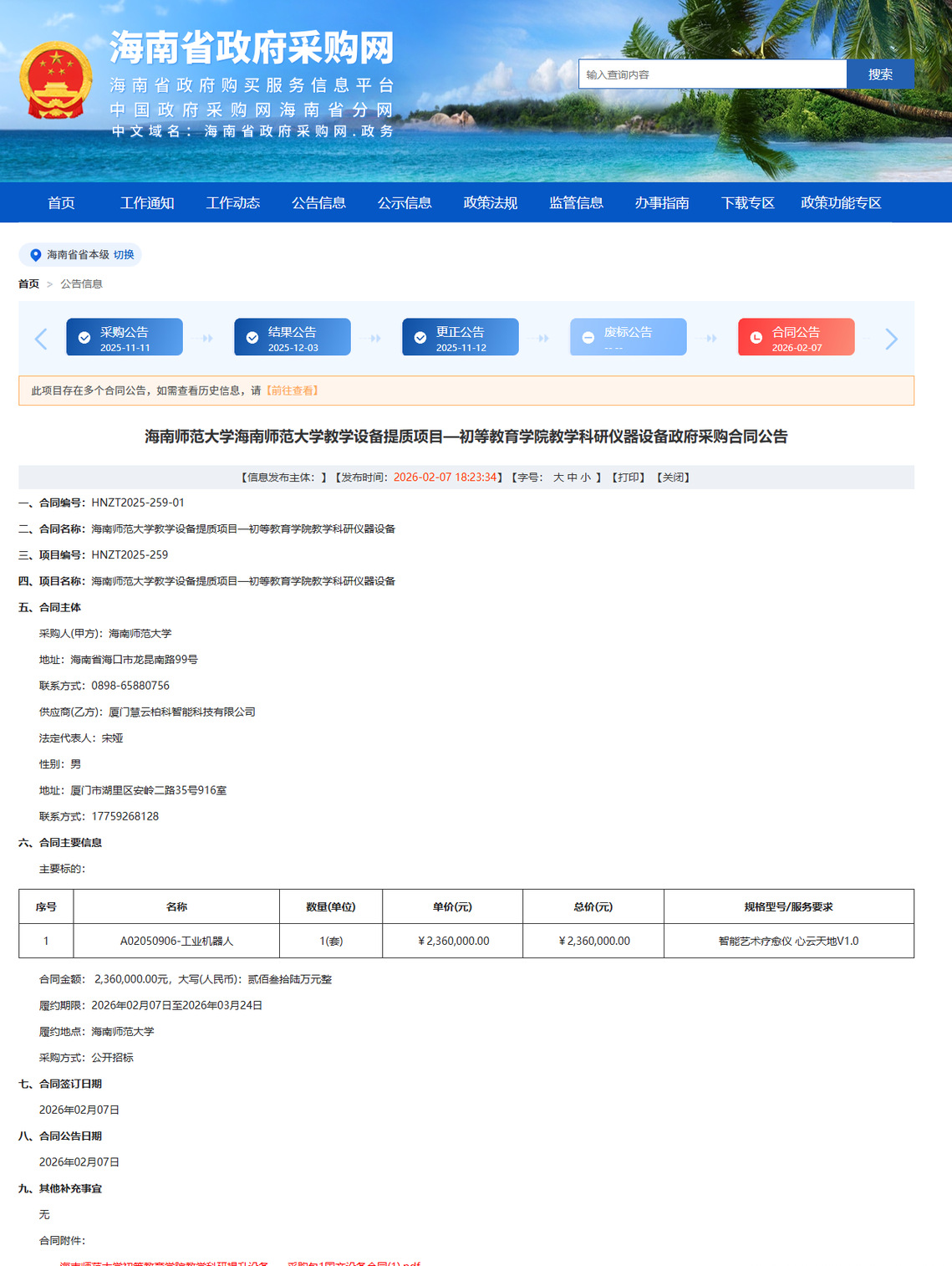 公告链接:https://ccgp-hainan.gov.cn/maincms-web/articleHn?type=notice&id=2068205b-7f8a-490c-beb7-b87d141947e1&planId=8a1d13439a01264e019a14b3afc12711
